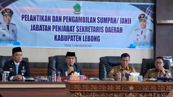 Bupati Lebong H Azhari SH MH menyampaikan ucapan terima kasih kepada Plt Sekda Lebong sebelumnya yang dijabat Asisten II Setda Lebong Donni Swabuana ST M.Si. Kemudian dirinya juga menyampaikan ucapan selamat kepada PJ Sekda Lebong yang baru Dr. H Syarifudin M.Si. Dirinya memastikan bahwa prosesi pelantikan Pj Sekda dilaksanakan sesuai tindak lanjut SK Gubernur Bengkulu H. Helmi Hasan nomor N.953.BKD tahun 2025 tertanggal 1 September 2025 lalu