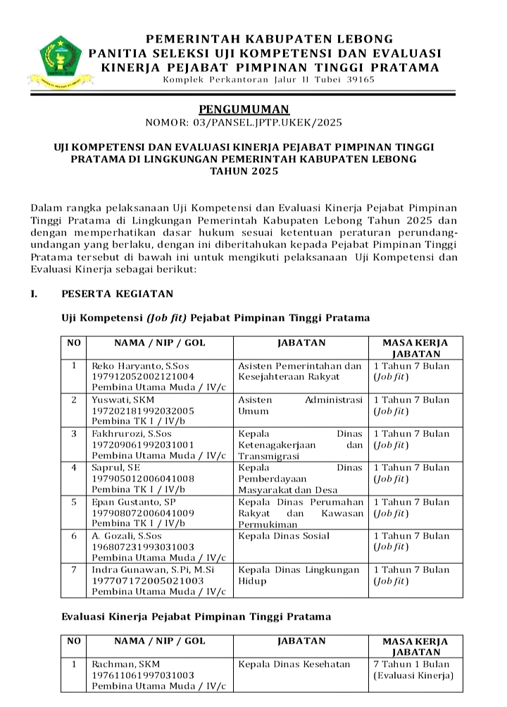 Pengumuman dengan nomor 03/PANSEL.JPTP.UKEK/2025 tentang Uji Kompetensi Dan Evaluasi Kinerja Pejabat Pimpinan Tinggi Pratama di Lingkungan Pemerintah Kabupaten Lebong Tahun 2025. Deri 8 orang pejabat eselon II tersebut terbagi 7 orang mengikuti uji kompetensi dan 1 pejabat lainnya mengikuti evaluasi kinerja.